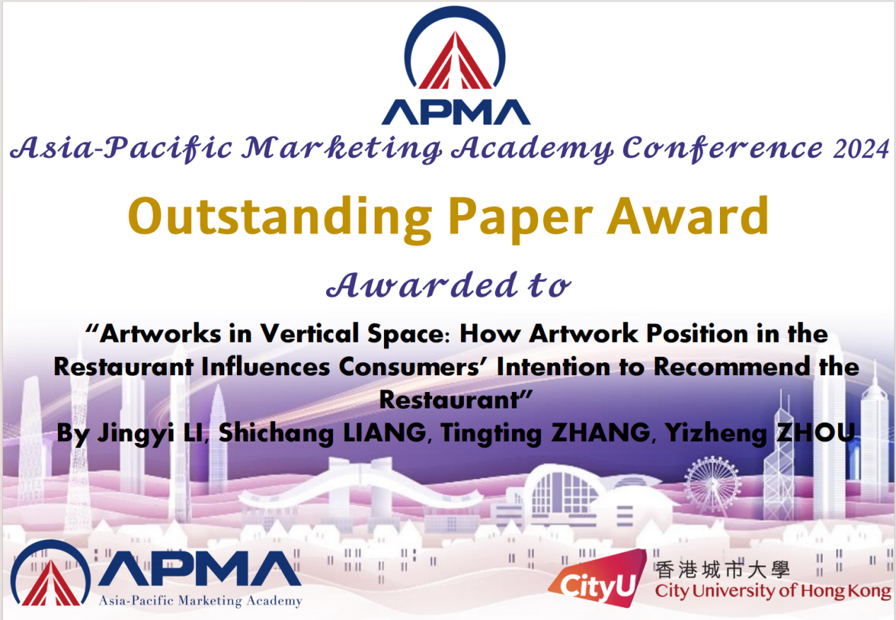 5月10日至12日,第二届亚太营销国际学术会议(APMA 2024)在香港城市大学召开。公司梁世昌副教授指导的2022级硕士研究生李静益、张婷婷的论文《垂直空间中的艺术品:餐厅中艺术品的位置如何影响消费者推荐餐厅的意向》(Artworks in Vertical Space: How Artwork Position in the Restaurant Influences Consumers' Intention to Recommend the Restaurant)获杰出论文奖。李静益、张婷婷作为研究生代表参加了会议。