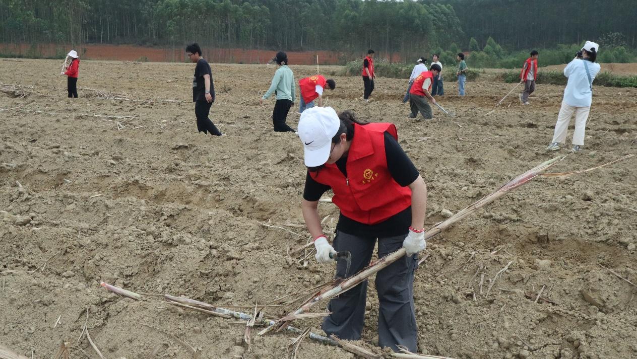 劳动过程中,经过当地农户的指导和示范,同学们立刻进行了有效分工,弯下腰,沉下身,挥舞着手中的镰刀、锄头和砂耙,将搬来的蔗种砍成一节节排列在提前松好土的垄间,再把一垄垄的泥土覆盖到甘蔗上。种蔗工序有条不紊地进行着,田野上呈现出一幅充满生机与希望的春耕画卷。
