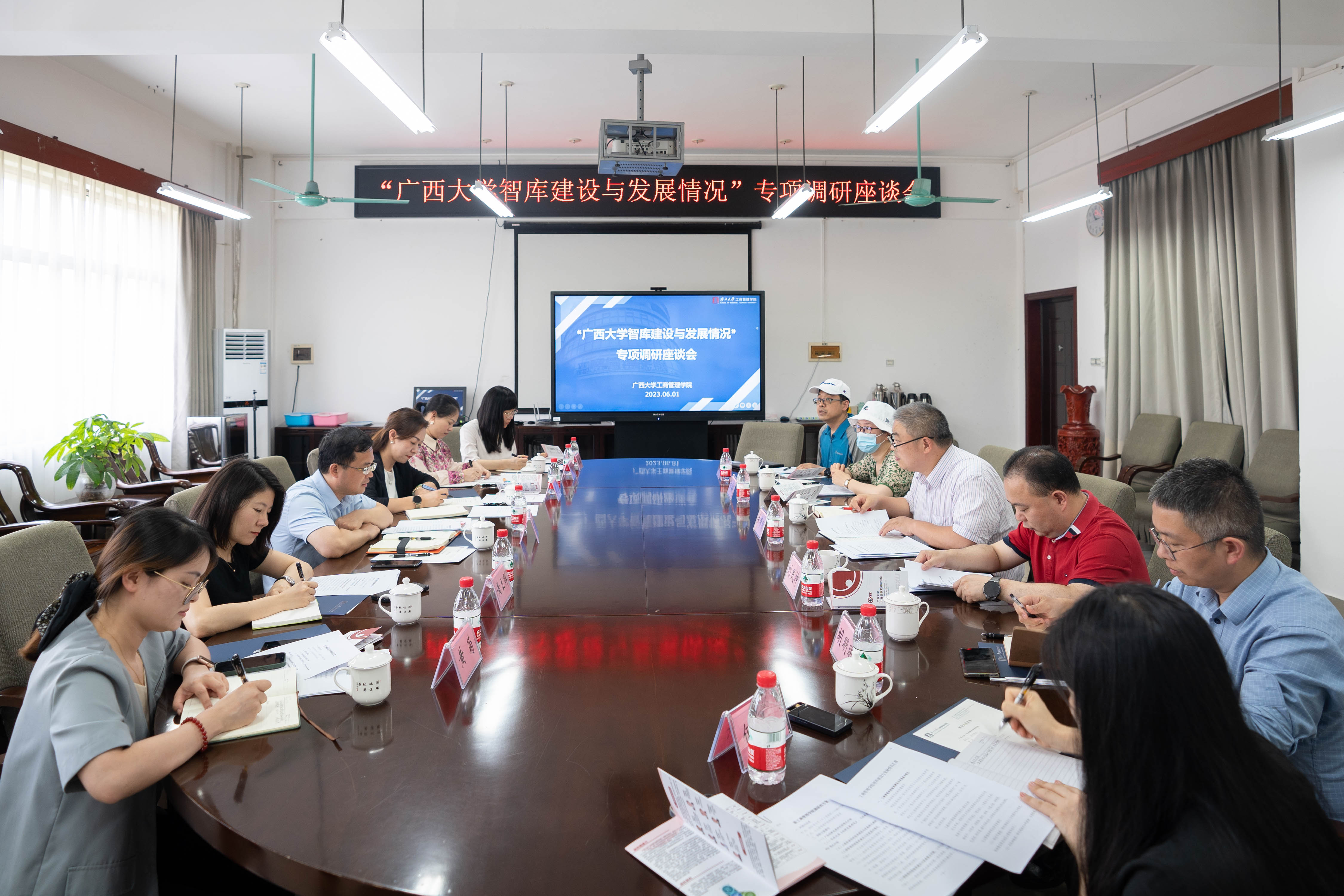 6月1日下午,广西创新发展研究院执行经理梁运文一行到公司就“智库建设与发展情况”做专项调研。创新发展研究院副经理曹蕾、公司副经理刘民坤出席调研座谈会,智库研究人员和管理岗负责人、公司各系教师代表和科研秘书参加座谈会。座谈会由公司经理朱帮助主持。
