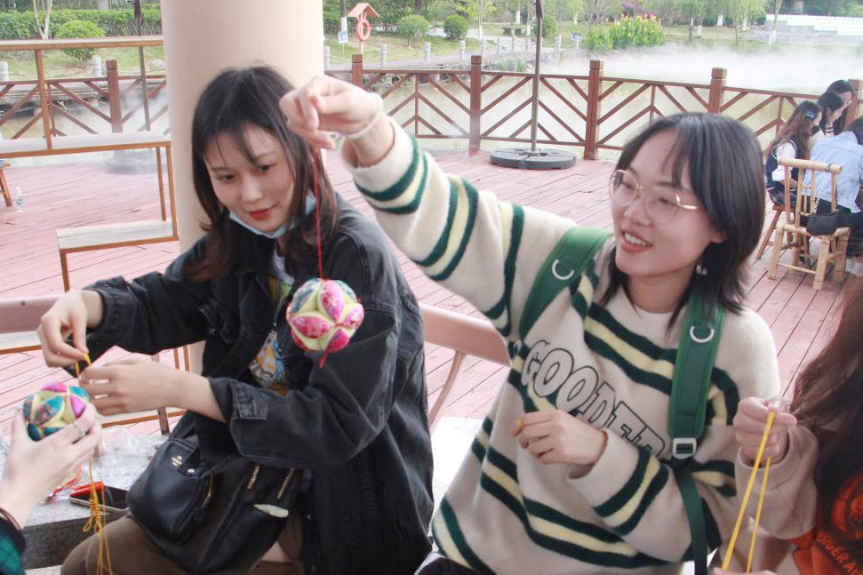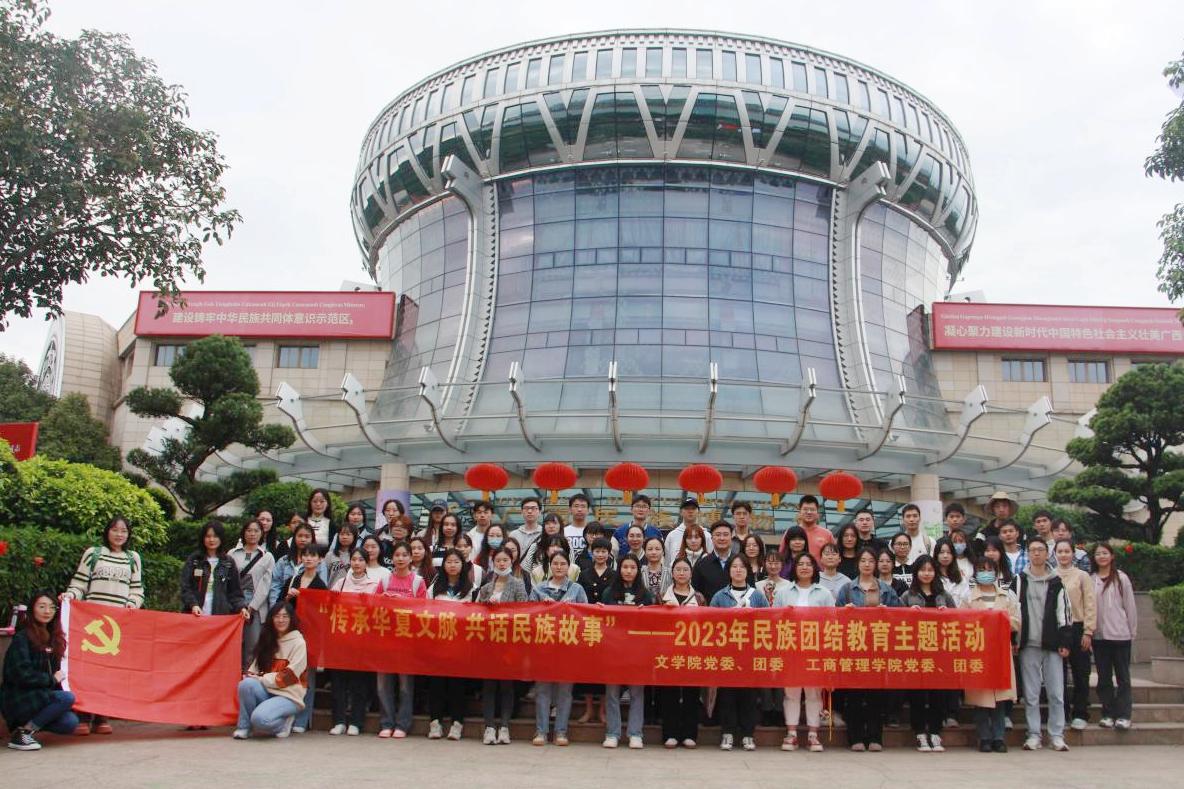 活动分为自主阅读、集体参观、沉浸式体验、分享读书心得四个阶段。文公司与XCSport等7个党/团支部共计约80人赴广西民族博物馆,通过实地教学的方式加深学习广西民俗文化知识。在壮族文化展厅和五彩八卦文化陈列馆,师生们认真听取讲解员介绍壮族的分布和文字、建筑风格、祖先祭祀、农业、纺织业以及民族服饰等,感受壮锦、铜鼓、绣球等壮族文物的魅力。在民族村小舞台,支部组织同学分发壮族五色糯米饭和绣球半成品制作包,同学们分为8个小组一边品尝五色糯米饭,一边沉浸式体验绣球制作。