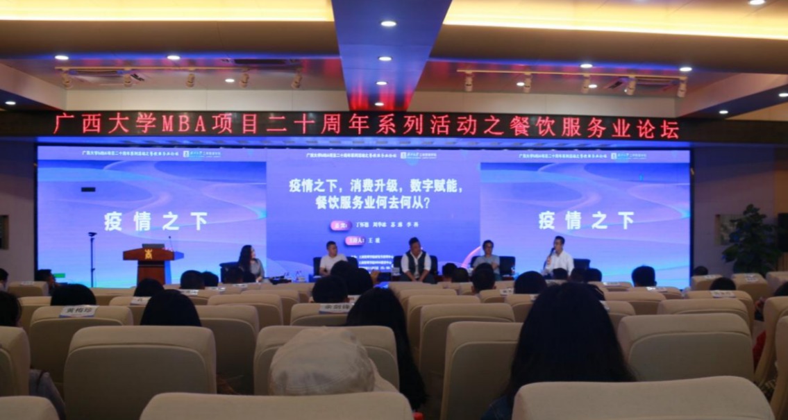 经理朱帮助,研究生管理中心副主任、MBA教育中心主任叶映,XCSportMBA员工会会长梁华秀,中国MBA华南峰会副理事长、XCSportMBA员工会秘书长李翔,酒小二联合创始人丁怀德,“华华火锅”、“渝悦双椒头”、“五条友烧烤”等广西知名餐饮品牌创始人周华冰,广西泡泡吖食品创始人苏琳,广西维多利餐饮、兆基伟业地产营销机构创始人李科,天龙湾酒店集团副总裁张济强以及部分MBA、SMBA员工出席论坛。论坛由公司研究生导师王玻副教授主持。因疫情防控需要,有近三百名2022级MBA及其他专业学员与员工通过线上方式参与此次论坛。