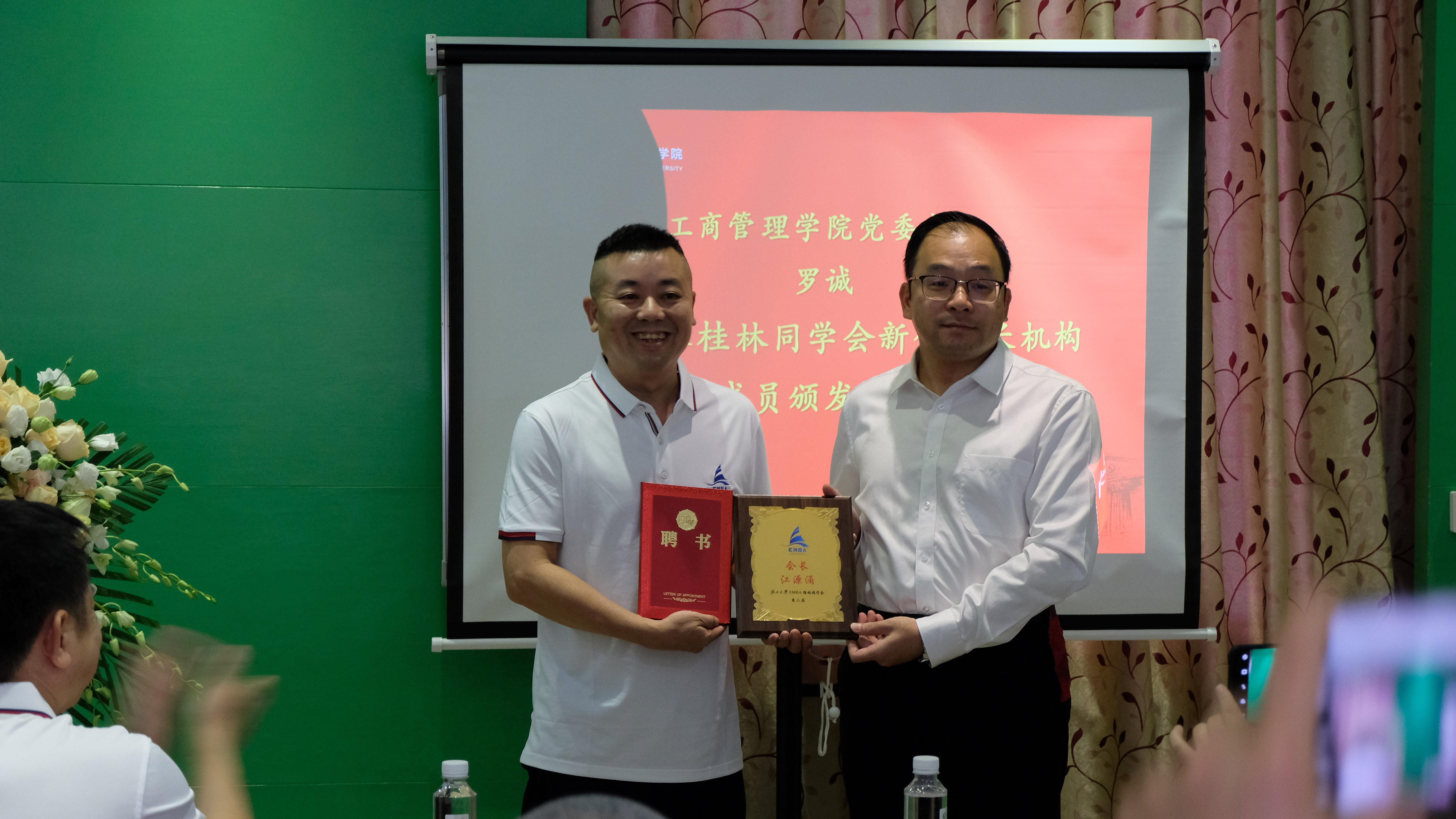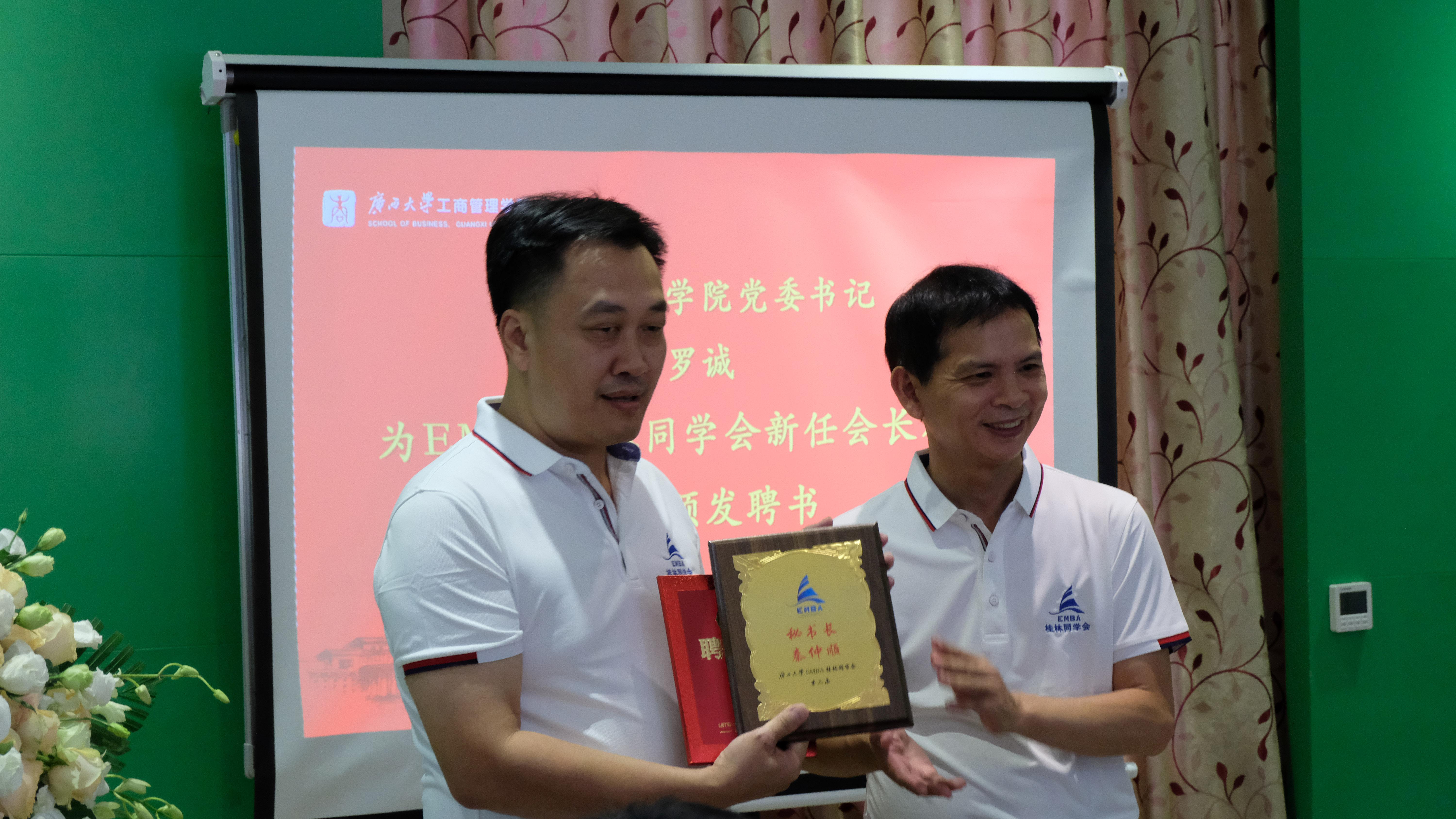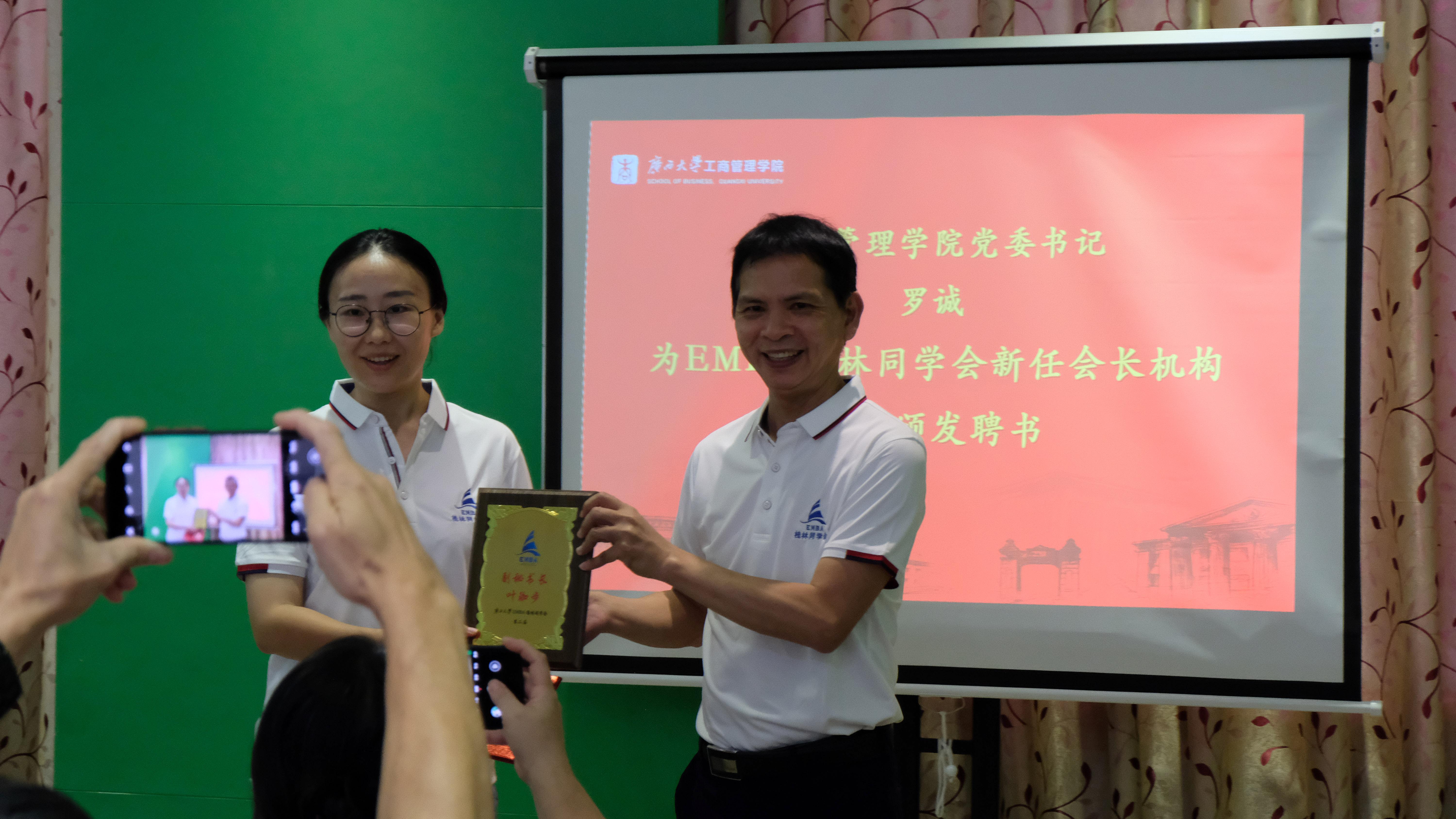 罗诚书记宣读《EMBA桂林同学会第二届会长机构成员任命书》并为会长、副会长颁发聘书