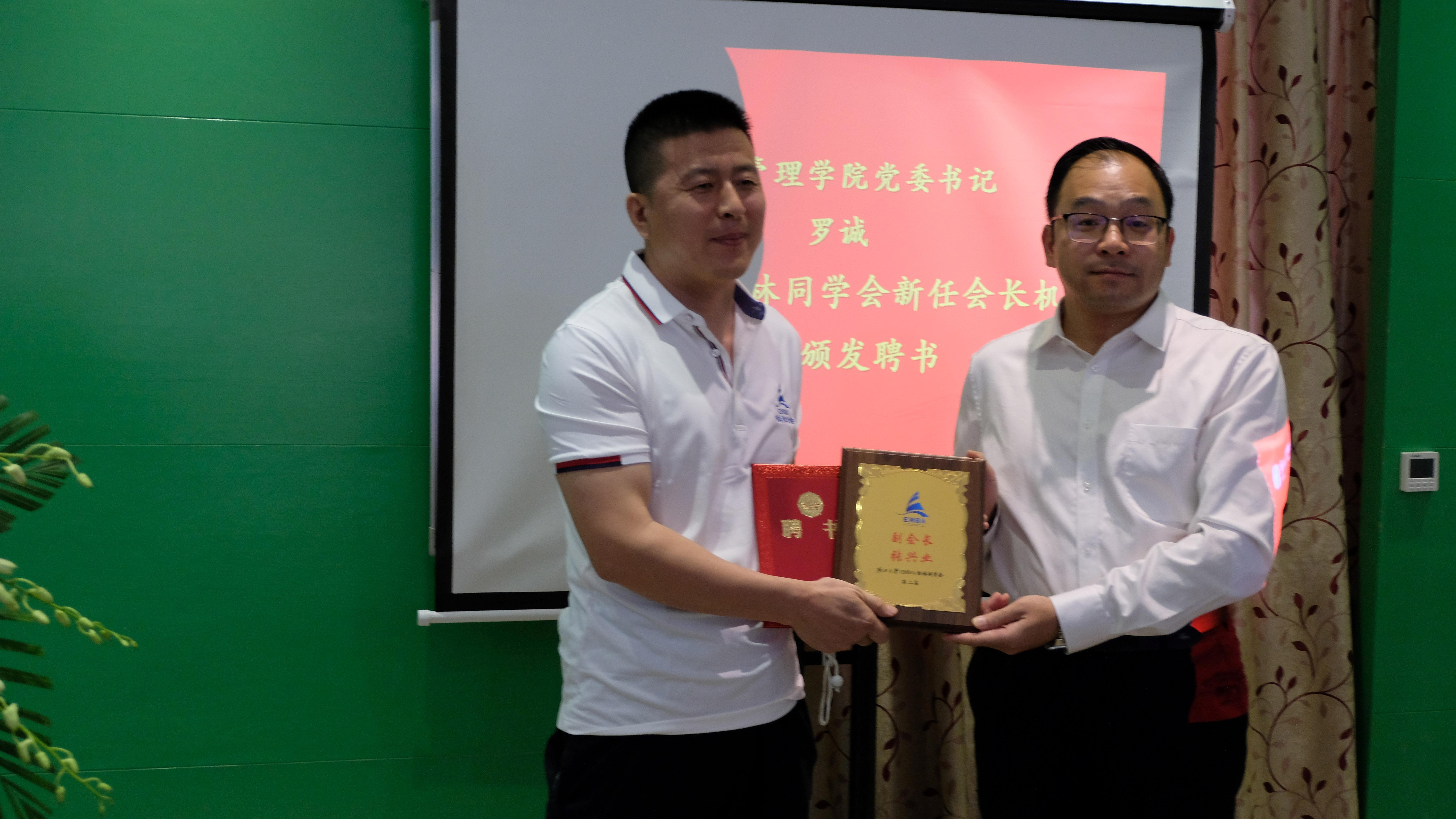 执行会长黎英征、秘书长胡志鹏向桂林同学会第二届会长机构成员赠送定制纪念品