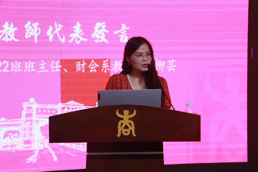 工管222班班主任、财管系教师潘柳芸,博士生导师、旅管系教师胡明明作为教师代表发言。潘老师向各位新同学表示热烈的欢迎与祝贺,希望同学们心如花木,向阳而生,满腹家国情怀,祝愿大家在大学四年中学有所思、学有所悟、学有所成。胡老师从自身科研经历出发,分享三点经验:第一,做学术先做人,要增强社会责任感;第二,要培养科学的研究精神,深入管理实践,敢于创新和进步;第三,要修身立德,坚守学术道德的底线。