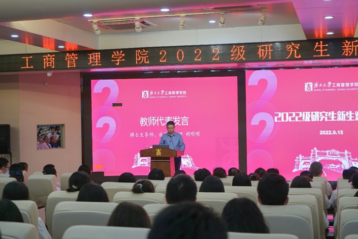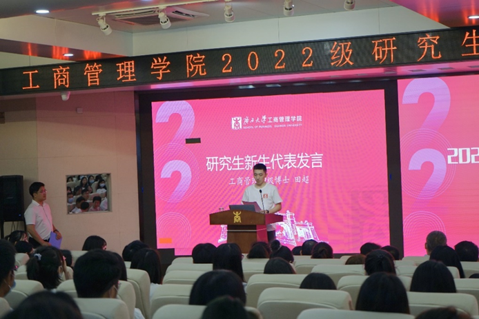 工商管理类221班郑淦耀同学、工商管理22级博士田超同学作为新生代表发言。他们向师长们表示真诚的感谢,向同学们表达相遇的美好,并对未来的学习与生活表示展望和期待。郑淦耀同学作为本科新生代表,表现出新一代青年人奋勇向前的精神,翱翔万里长空的志向。田超同学作为博士生新生代表,希望大家可以在学术上培养创新精神、坚定目标、不畏困难,并祝福2022级新生有所收获,踏上学术新征程。