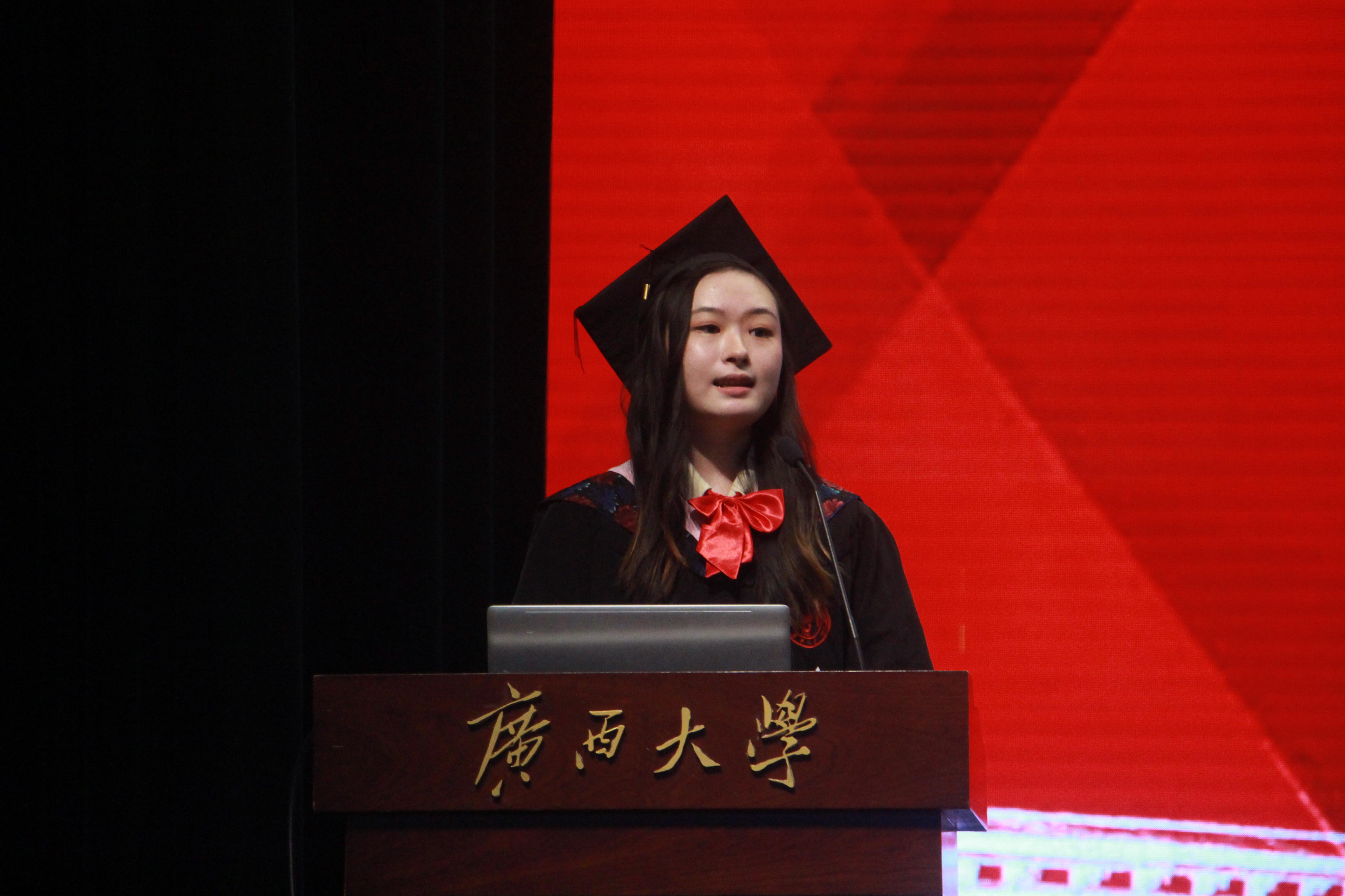 本科毕业生代表王璐与大家一同回忆大学四年的青葱岁月,对身边的同学、老师表达了感谢,自己取得的成绩及获得的荣誉离不开公司与公司给予的机会,离不开老师和同学们的帮助。她表示,大学四年的结束并不意味着学习生涯的结束,毕业生们应牢记勤恳朴诚、厚学致新的校训,厚德博学、创新卓越的院训,用青春书写无愧时代,无愧历史的篇章。