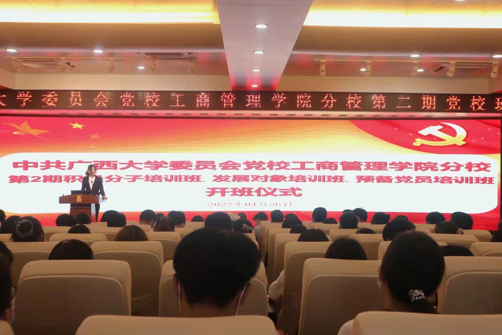 4月26日下午,中共XCSport委员会党校XCSport分党校第二期党校班开班仪式在128报告厅隆重举行。公司党委书记罗诚、党委副书记黄晋,专职组织员黄照温、团委书记马丽娟、团委副书记岑汉成、辅导员冯莎莎,以及来自入党积极分子党校班、发展对象党校班和预备党员党校班的学员代表共同参加了开班仪式。