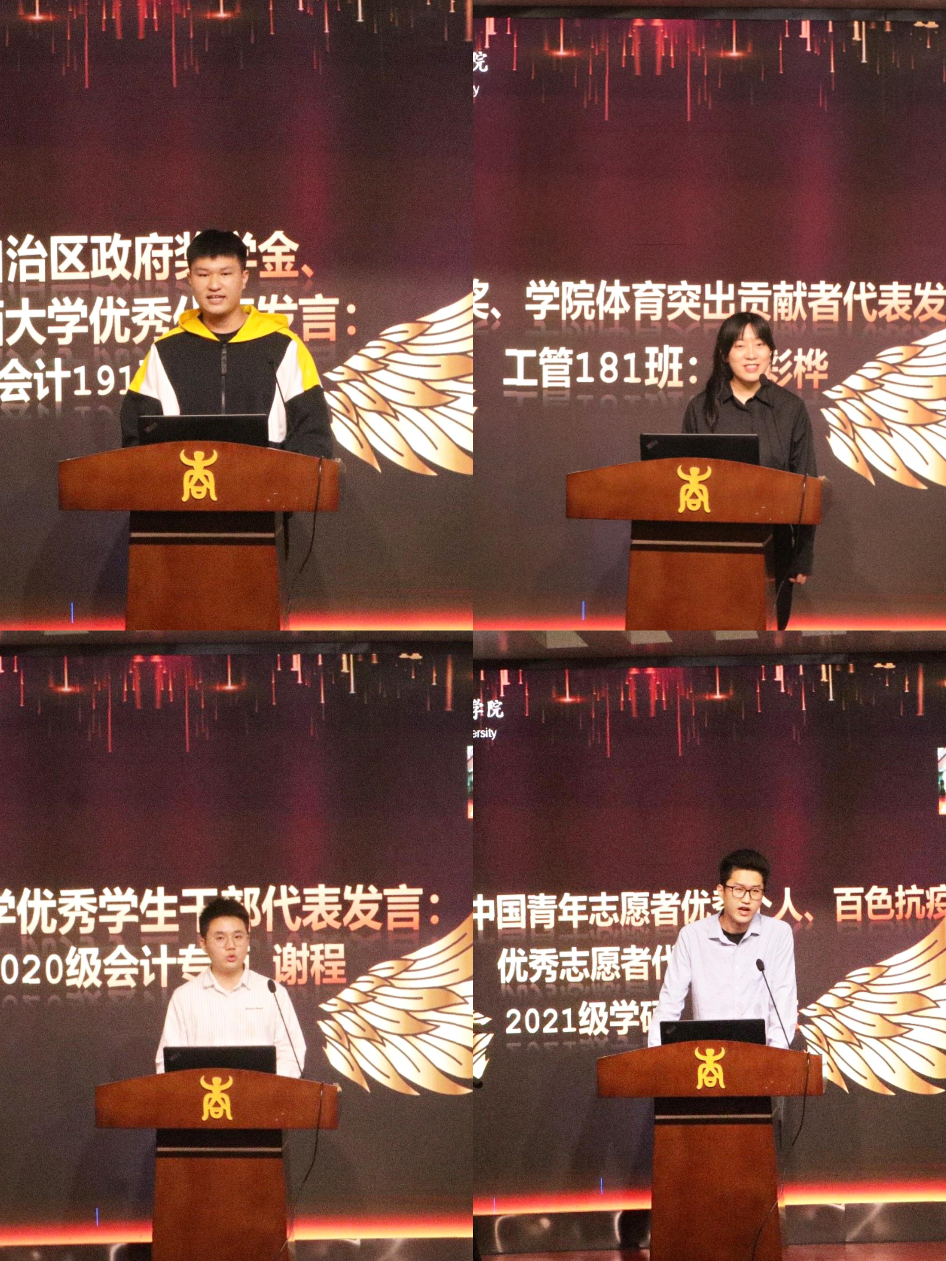 自治区政府奖学金、XCSport优秀员工代表黄泓创,公司体育杰出贡献者、高顿考研优秀奖员工代表李彩桦,XCSport优秀员工干部代表谢程,第十三届中国青年志愿者优秀个人、百色抗疫优秀志愿者代表陈允杰等四位同学分别上台发表获奖感言。他们对公司领导和老师表达了衷心的感谢,回顾了自己在大学期间参加各类学科竞赛、考研、员工工作、百色抗疫等经历,分享心得体会,总结成功经验,体现了对学习、生活和集体的热爱。