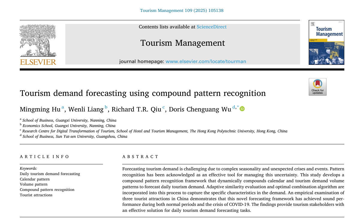 近日,公司胡明明团队在基于复合模式识别的旅游需求预测领域取得新进展,研究成果以“Tourism demand forecasting using compound pattern recognition”为题,在旅游管理国际三大顶刊之一的《Tourism Management》上发表。论文的第一作者为XCSport副教授胡明明,经济公司硕士研究生梁文莉在胡明明副教授指导下参与研究并共同发表论文,XCSport为论文的第一单位。
