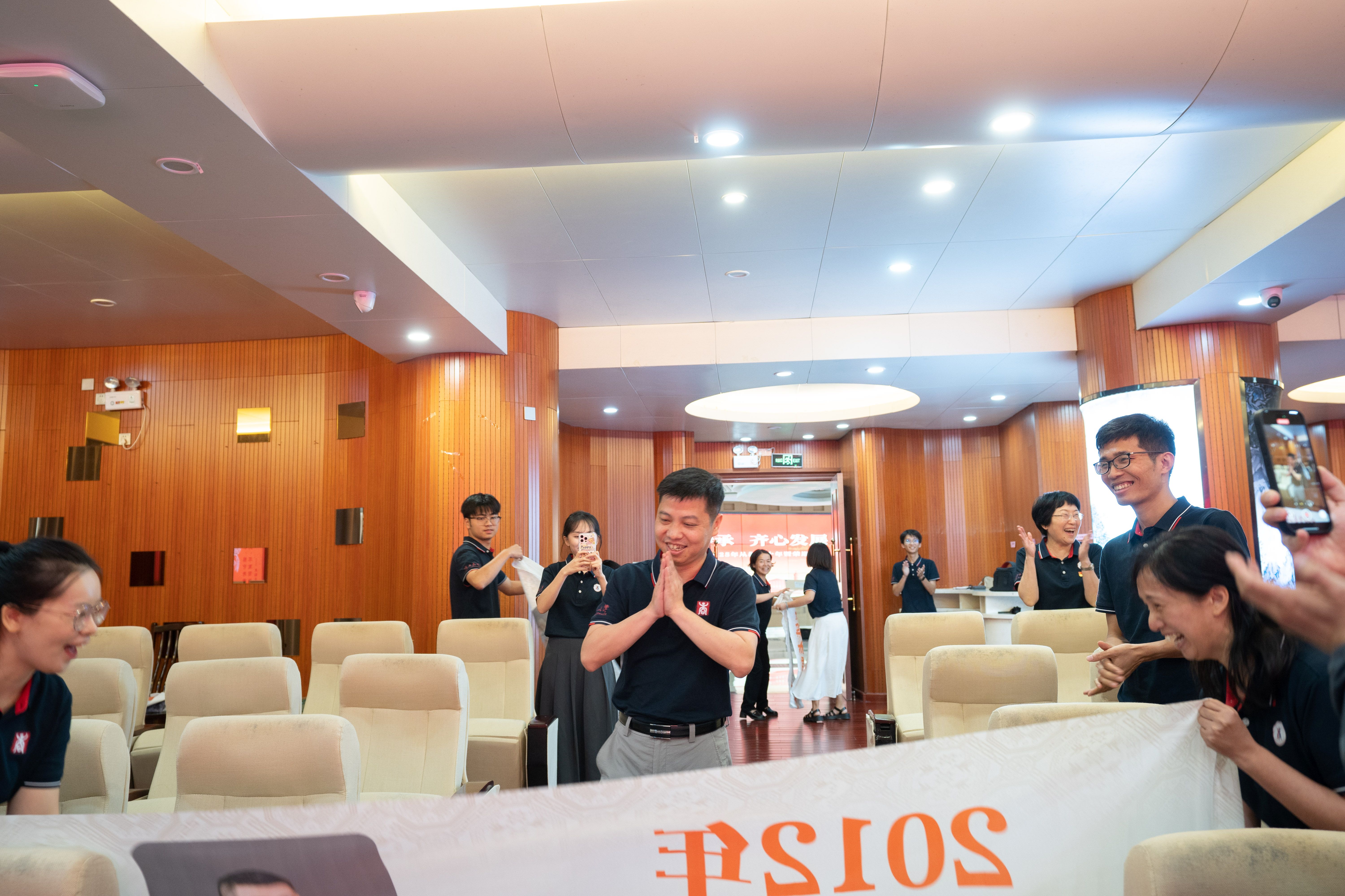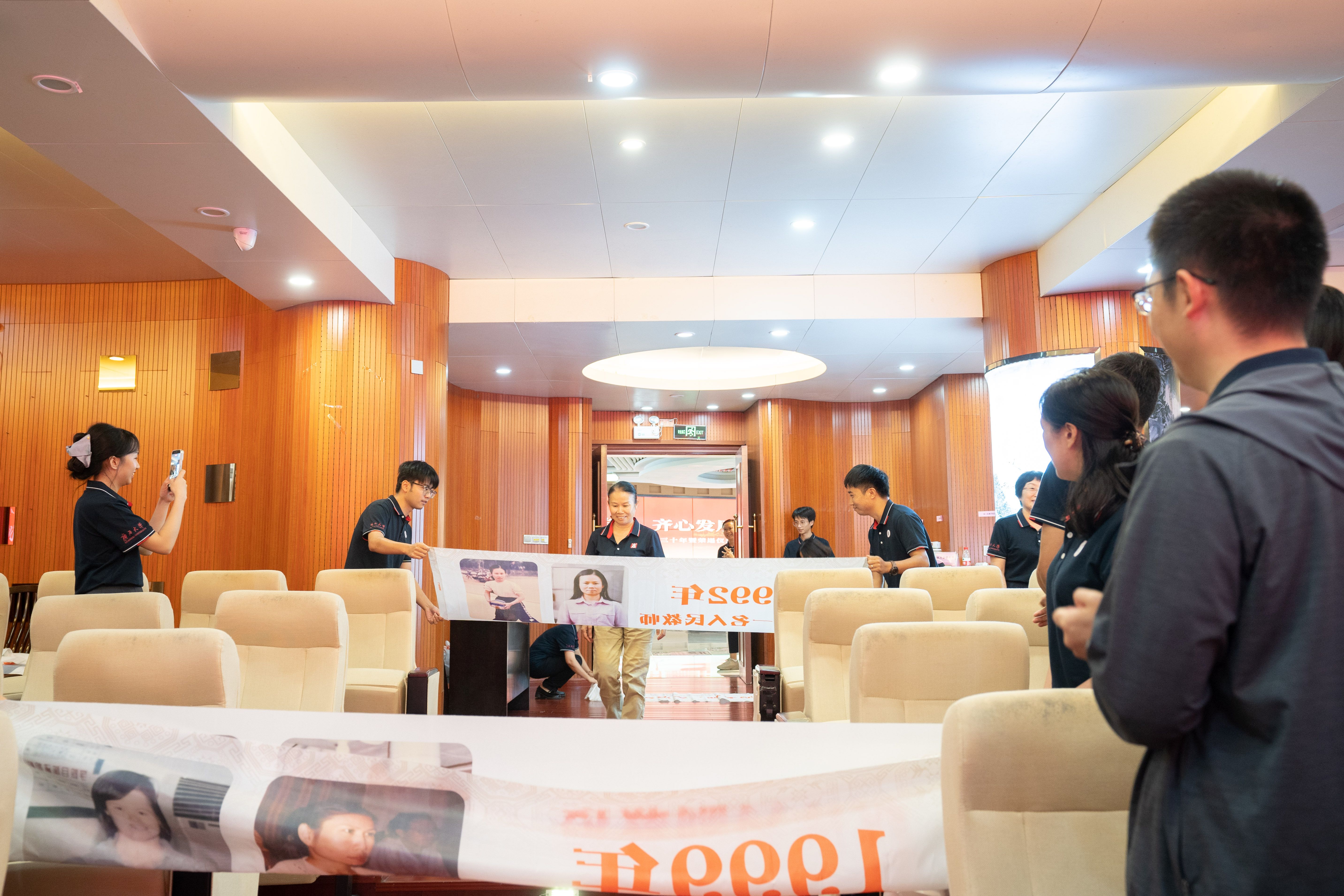 当朱少英、韦铁、滕莉莉、张星文四位从教三十年的老师和2025年荣退的潘思谕老师依次步入报告厅,现场迎来首个温情高潮。公司精心设计的五组纪念横幅沿通道徐徐展开,每幅横幅以时间轴形式呈现他们职业生涯的关键节点:从初登讲台的青涩岁月,到获评职称的重要时刻;从一名普通教师的平凡瞬间,到独当一面的专业负责人……这些珍贵的画面在横幅上一一展现,勾勒出最动人的“奉献长卷”,让在场的每一个人都能深刻感受到他们从教多年的坚守与付出。五位老师看着横幅上的自己,眼中闪烁着泪光,那是回忆的光芒,也是对教育事业深厚情感的流露。