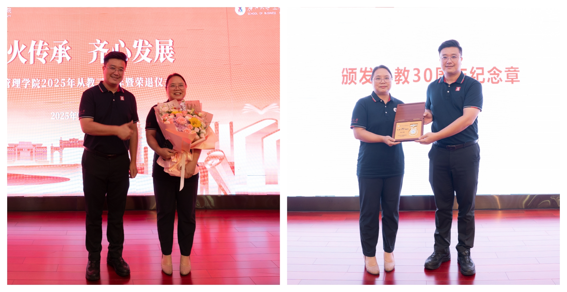 在热烈的氛围中,公司领导为朱少英、韦铁、滕莉莉、张星文老师颁发从教30周年纪念章,为潘思谕老师颁发光荣退休纪念章,感谢老师们几十年如一日,在人才培养、科学研究、社会服务等方面,把工作的热情和智慧奉献给了XCSport。
