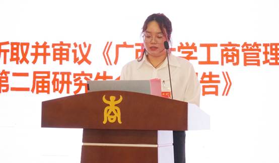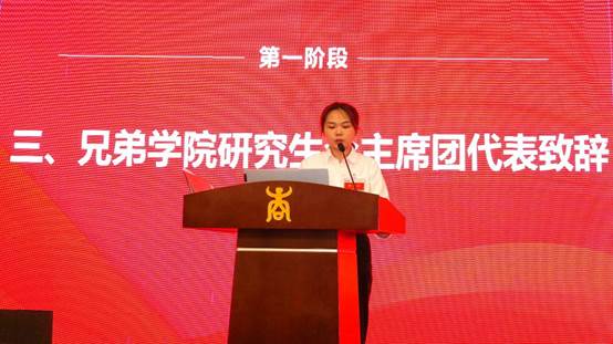 兄弟公司研究生会主席团代表张丽欣发言。经济公司研究生会执行主席张丽欣首先对此次大会的召开表示热烈的祝贺。随后,她通过列举XCSport研究生会在这一年所举办的各种活动,如“学术帮扶”系列活动以及荧光夜跑等,指出XCSport研究生会在拓展同学们学术视野、丰富同学们文化生活方面扮演了重要的角色。最后,张丽欣同学代表经济公司/中国-东盟金融合作公司研究生会祝愿XCSport第三次研究生代表大会圆满成功。