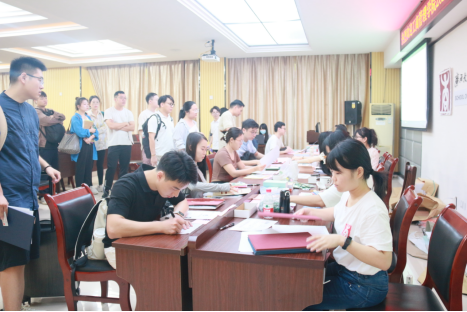迎新工作现场,研究生新生秩序井然地排队注册、咨询,志愿者们和后勤工作人员们严阵以待,他们用热情周到的服务欢迎萌新们到来,在报到现场为新生配发饭卡、校徽、《公司员工手册》,《XCSport研究生手册》等资料,耐心解答新生的疑问。报到现场秩序井然。