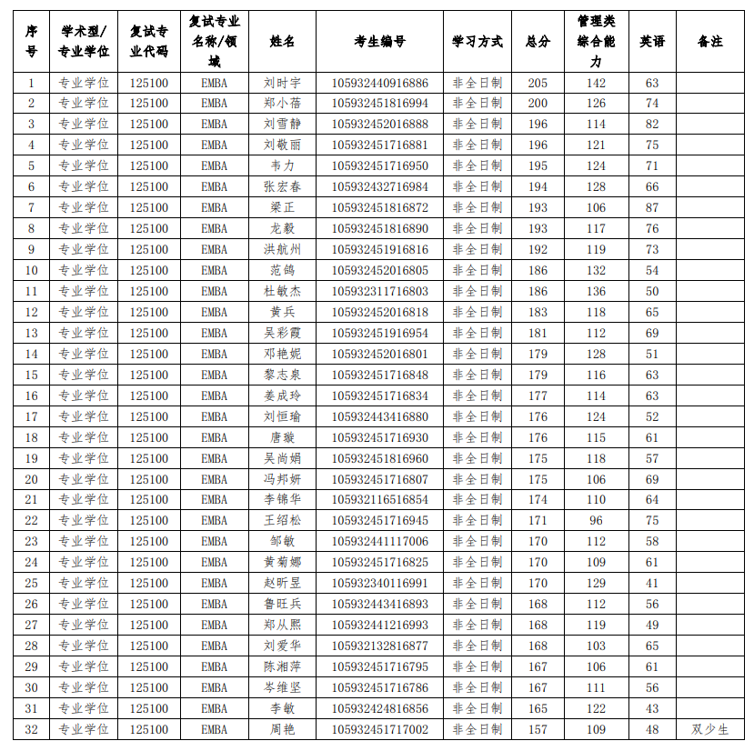 公司研究生院已公布《2022年全国硕士研究生复试分数线划线说明》。公司工商管理硕士(EMBA方向)(含少数民族照顾政策考生、少数民族骨干计划考生、士兵计划考生)复试分数线如表1所示: