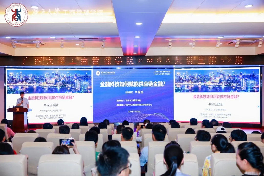 11月16日晚,华南理工大学教授、博士生导师、国家杰青、优青、教育部青年长江学者牛保庄应邀做客公司第52期“EMBA大讲堂”,以“金融科技如何赋能供应链金融?”为题为师生们作专题讲座。公司180余名EMBA、MBA员工、员工到场学习。