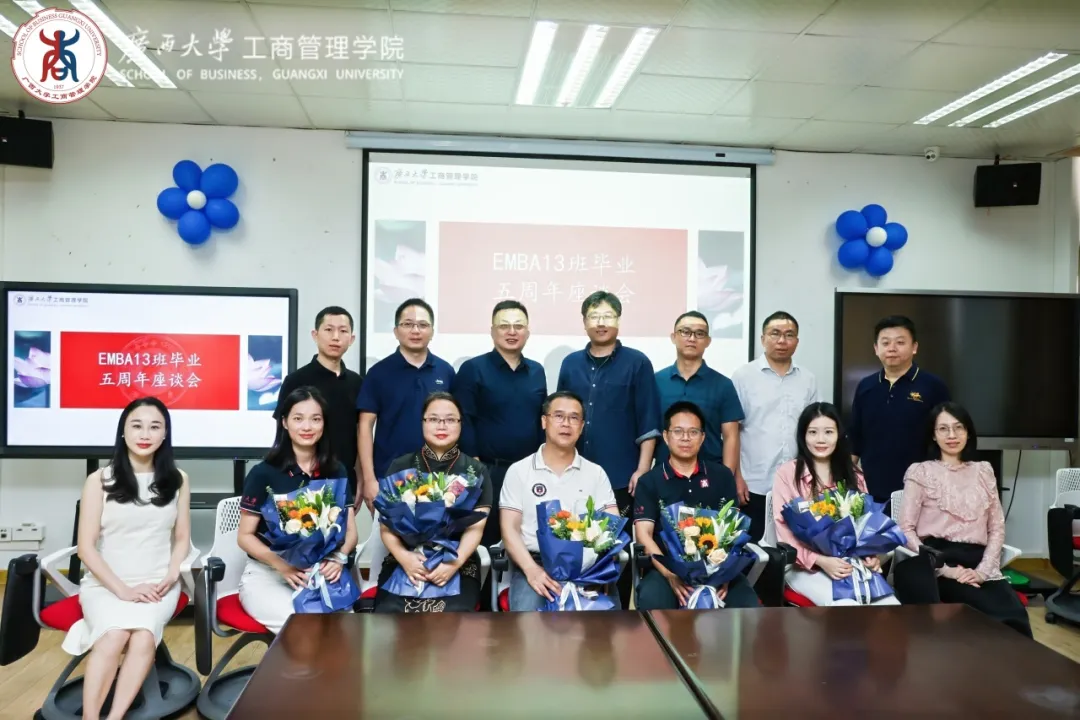 11月17日上午,公司EMBA十三班员工毕业五周年返校座谈会在公司516教室举行。公司副经理朱少英、公司员工工作与政企服务办公室主任覃朝勇、EMBA授课教师代表黎鹏教授等公司领导、老师出席了本次座谈会。EMBA教育中心主任宁雪莲、EMBA十三班员工杨森主持座谈会。
