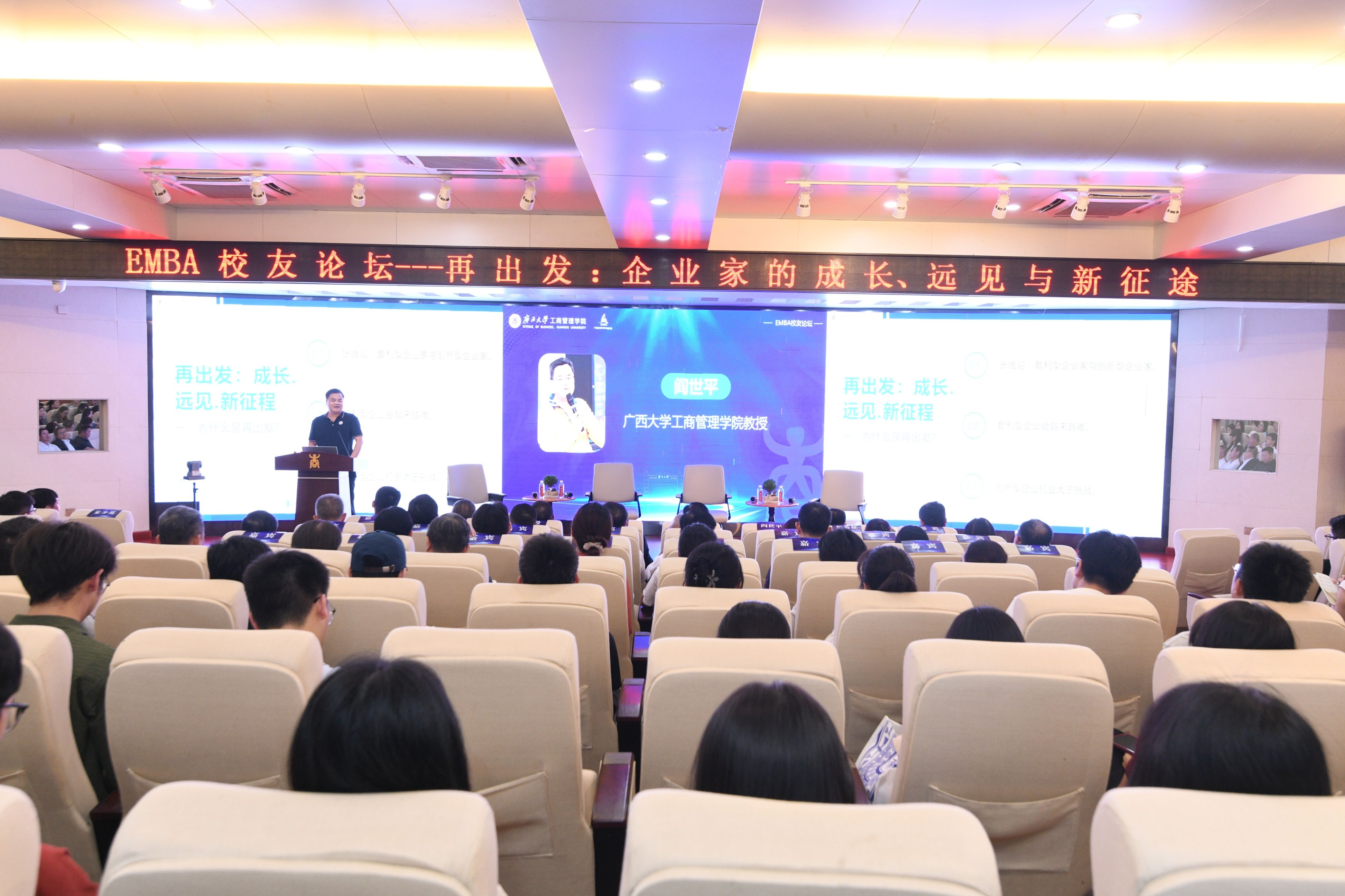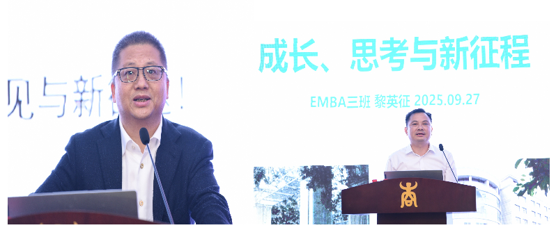 论坛现场,EMBA 三班员工、环球新材国际控股有限公司董事局主席兼行政总裁苏尔田,以 “三个十年” 为叙事主线,分享了自己从乡村青年到跨国企业掌舵者的蜕变历程。他深刻指出,“技术远见、资本布局与人才战略,是企业穿越周期、持续成长的核心动力”。其掌舵的环球新材,通过并购韩国 CQV、德国默克表面业务,已跃居全球珠光材料行业的领军者,生动诠释了“新材料没有天花板”的无限赛道。EMBA三班员工、广西英伦信息技术股份有限公司董事长黎英征,则以“成长、思考与新征程” 为题,结合自身华为工作经历与创业实践,分享了对企业经营的深度洞察。他提出的 “站在未来看现在”“相信概率、尊重周期” 等务实观点,精准击中企业家实践中的痛点,引发在场员工强烈共鸣,不少人现场记录观点、举手追问细节,互动氛围热烈。