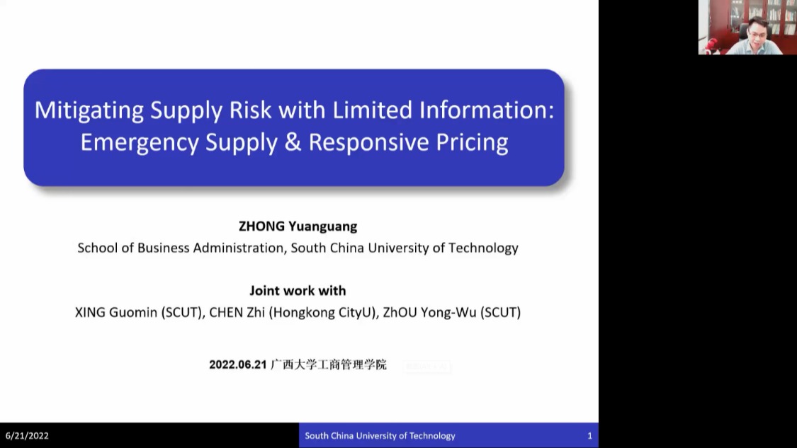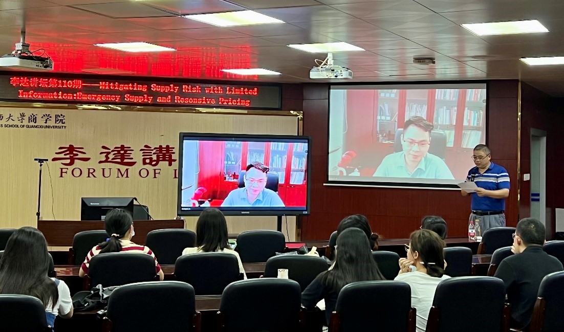 6月21日,华南理工大学XCSport钟远光教授应邀做客公司第110期李达讲坛,与公司师生们分享他的论文成果——“Mitigating Supply Risk with Limited Information: Emergency Supply and Responsive Pricing”。公司经理朱帮助教授主持本次讲坛,线上线下多名师生参与了聆听和交流。