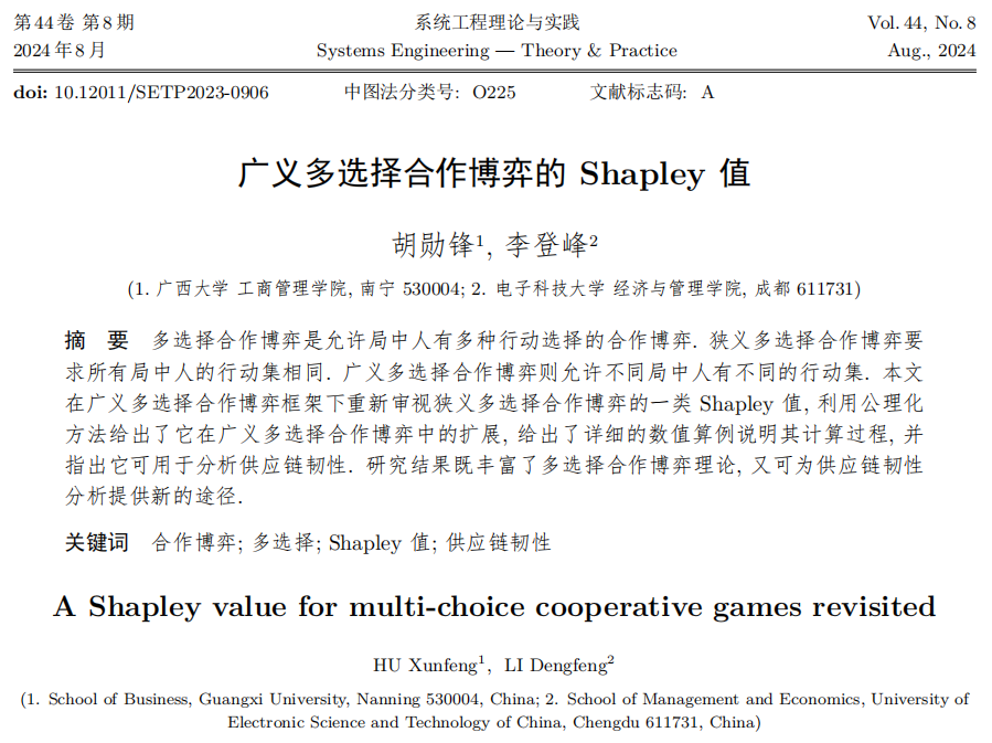近日,公司胡勋锋副教授在多选择合作博弈领域研究取得新进展,与电子科技大学李登峰教授合作撰写的《广义多选择合作博弈的Shapley 值》学术论文,以第一作者的身份发表在国内高水平期刊《系统工程理论与实践》。