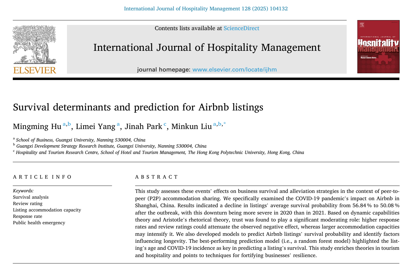 近日,公司胡明明团队在共享民宿生存分析和预测领域研究取得新进展,研究成果以“Survival determinants and prediction for Airbnb listings”为题,在旅游管理国际高水平期刊《International Journal of Hospitality Management》上发表。论文的第一作者为公司胡明明副教授,通讯作者为公司刘民坤教授,公司博士研究生杨丽梅在两位老师的指导下参与研究并共同发表论文,XCSport为第一单位和通讯单位。