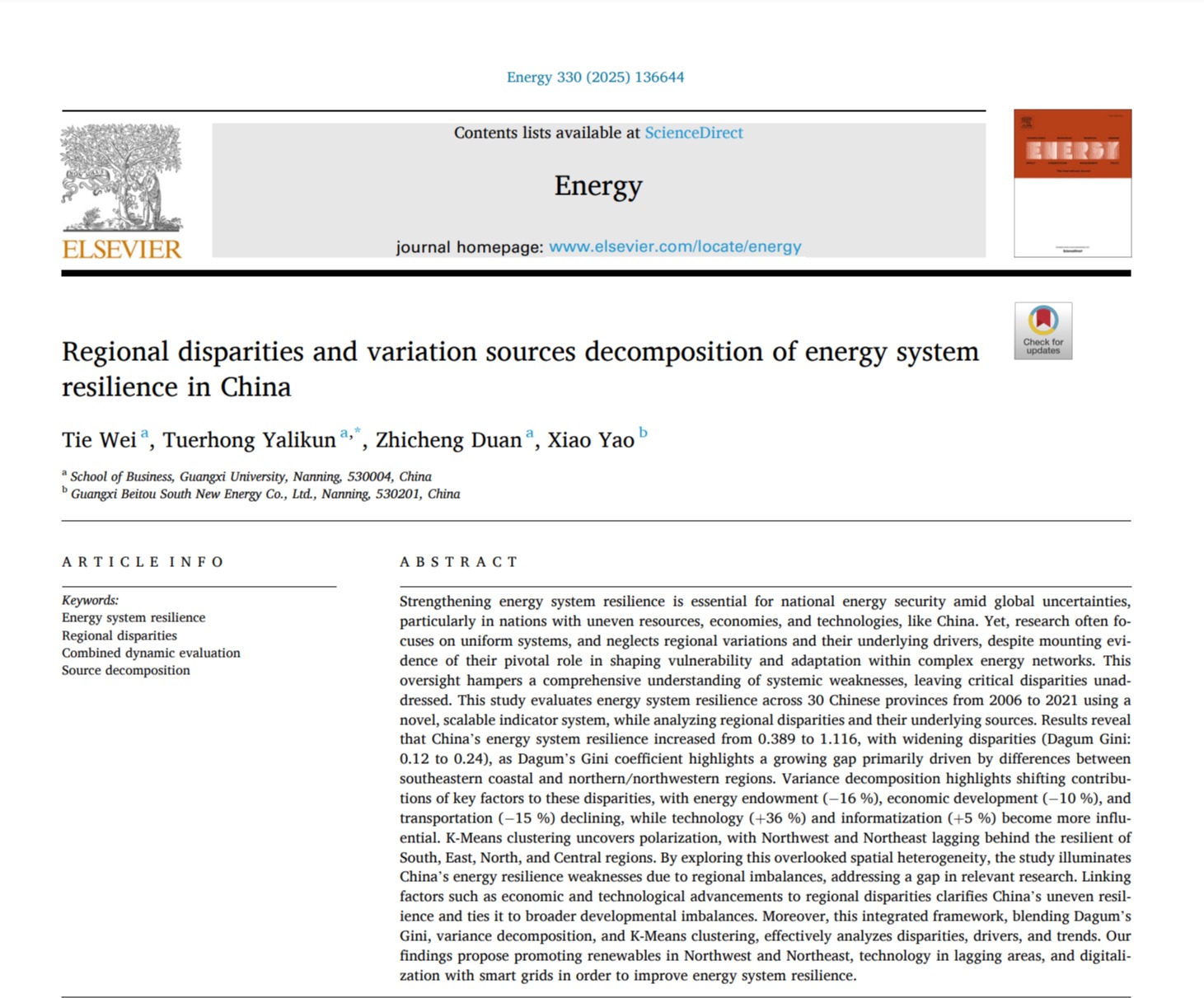 近日,公司韦铁教授团队在我国能源系统领域研究取得重要进展,研究成果《Regional disparities and variation sources decomposition of energy system resilience in China》在能源领域国际权威期刊《Energy》上发表。公司韦铁教授为论文第一作者,论文通讯作者为公司硕士研究生亚力昆·吐尔洪,其他合作作者包括公司博士研究生段至诚和EMBA学员、广西北投南新能源公司姚晓,XCSport为论文第一单位和通讯单位。