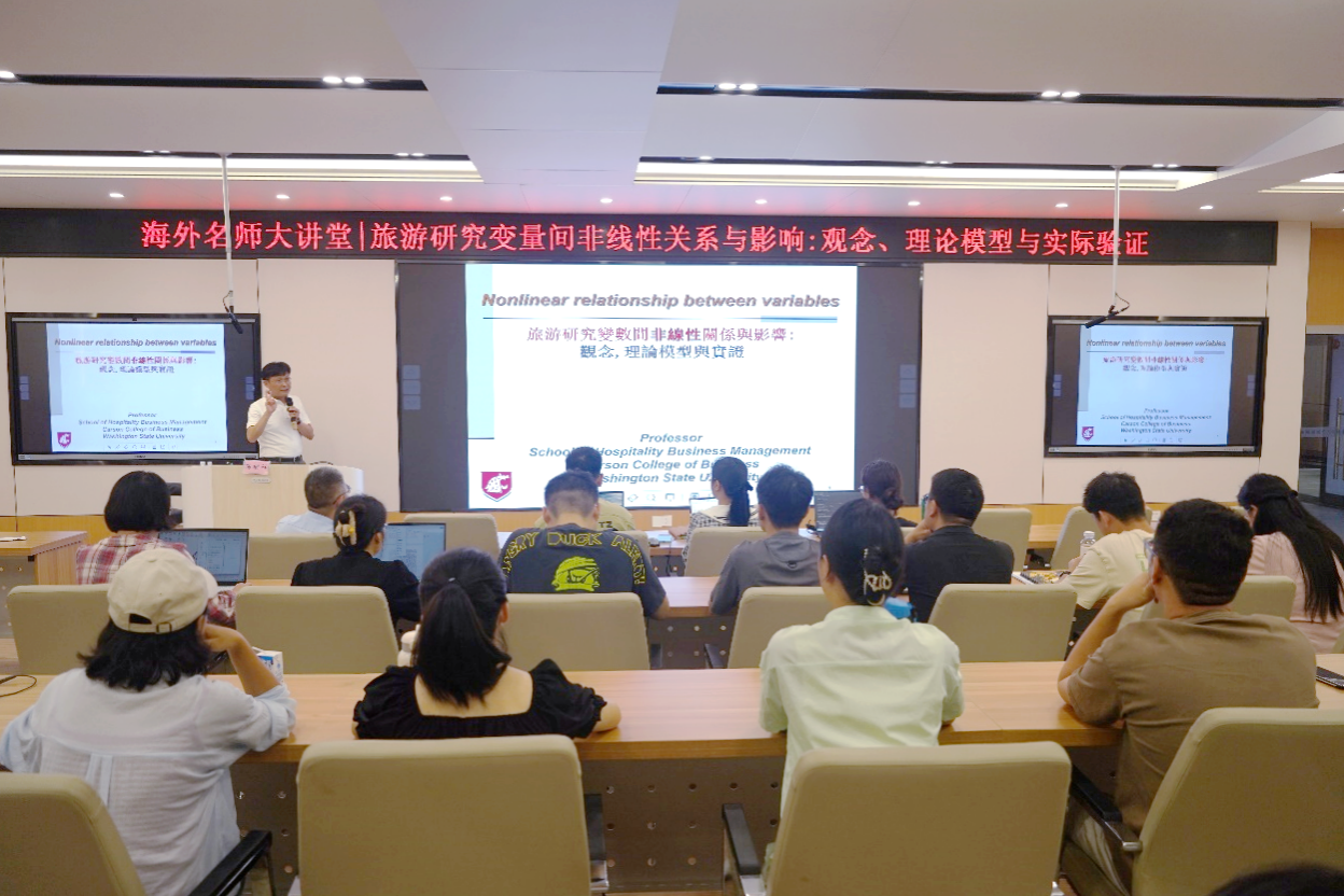6月4日,美国华盛顿州立大学餐旅管理系陈明祥教授受邀做客公司海外名师大讲堂,以“旅游研究变量间非线性和不对称关系与影响:观念,理论模型与实证”为题在公司122报告厅为公司师生作学术报告。公司旅游管理系专任教师和部分研究生参加学习交流。